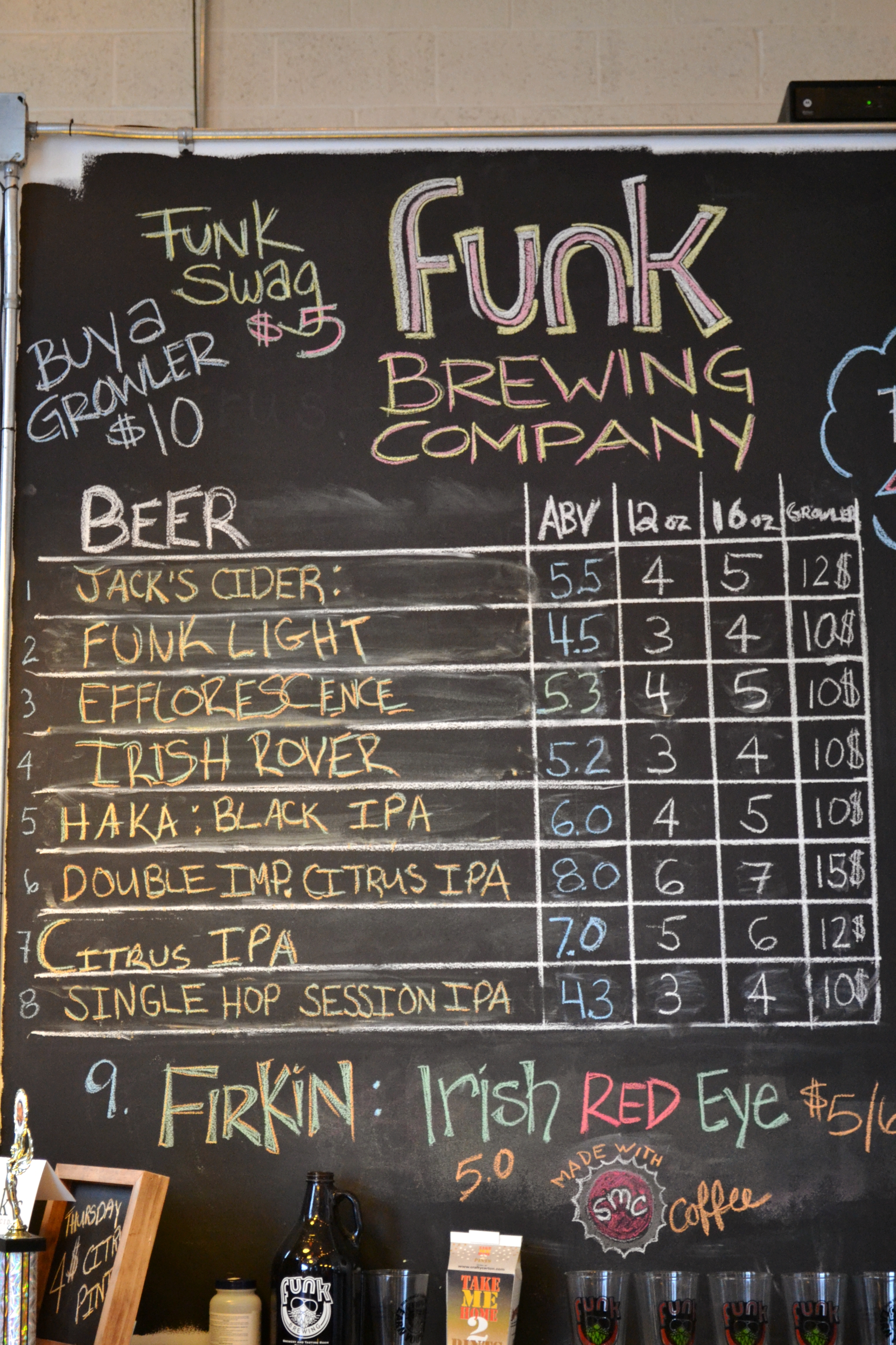 The Funk Brewing Company is the first brew pub in Emmaus. The El Vee wrote a great article on Funk’s history prior to their ability to sell beer by the glass. The article can be found here. Since the article’s publication (July 2014) the tasting room has opened and the prices cannot be beat, as you can see below.